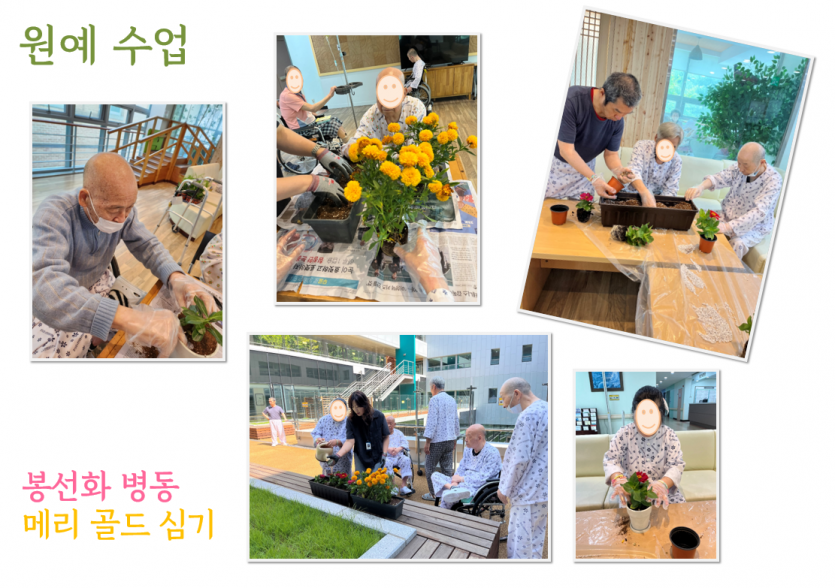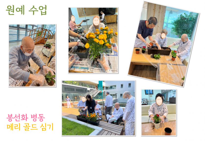 7월 비약물프로그램 (원예수업) 페이지 정보 작성자 경기도립노인전문동두천병원 댓글 0건 조회 1,281회 작성일 25-08-03 15:58 목록 본문 7월 원예수업시간에는 어르신들과 함께 병동내 에서 정성껏 심은 꽃들을야외 중앙정원에 예쁘게 전시하였습니다 이전글7월 비약물 프로그램(미술수업) 25.08.03 다음글7월 비약물프로그램 (공예수업) 25.08.03 댓글 0 댓글목록 등록된 댓글이 없습니다.